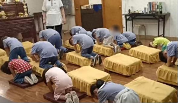 孩子们在幼儿园向“无生老母”等造像跪拜。图源:中国反邪教网